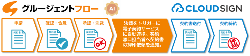 社内承認を得た契約書は、グルージェントフローより自動でクラウドサインに送付されるため、社内承認から契約締結までを自動化。契約プロセスをクラウド上で完結できます。