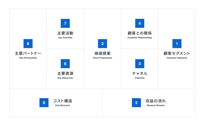 ビジネスモデルキャンバスは、以下9つの要素で構成されています。