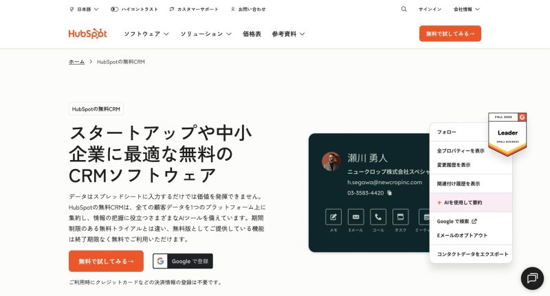 HubSpot CRMは無料で主要機能を利用でき、マーケティング・営業・顧客対応を統合管理可能です。インバウンド施策に強く、リード獲得やメール自動化を支援します。拡張機能で有料プランへの移行も柔軟です。