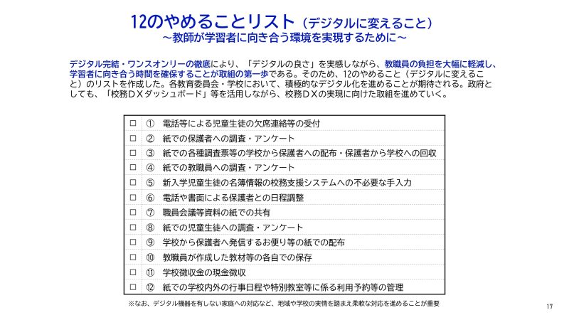 デジタル庁・総務省・文部科学省・経済産業省が定める「教育DXロードマップ」には、「12のやめることリスト(デジタルに変えること)」も紹介されています。電話による欠席連絡、紙のアンケート、手書き名簿の転記など、即座にデジタルへ移行し「事務のワンスオンリー(一度きりの入力)」を実現することが、教育DXの第一歩とされています。