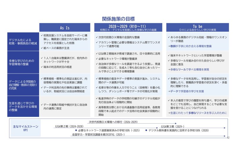 | デジタル化による教職員の負担軽減 | 旧来の紙ベースの業務や学校内に固定されたシステム環境(As Is)から脱却し、 「次世代校務DX環境」への全国的な移行を進めます。 |