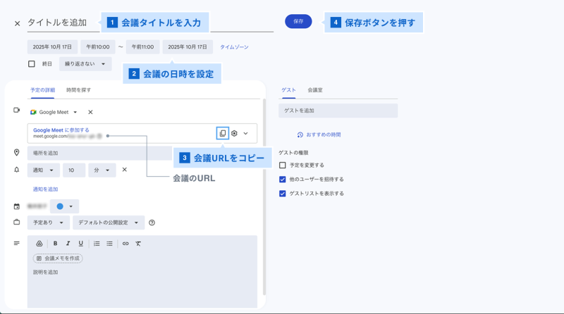 「Googleカレンダーでスケジュール」を選択した場合、画面中央の会議URLをコピーし、会議のタイトルや開催日時を設定した後に「保存」ボタンを押しましょう。
