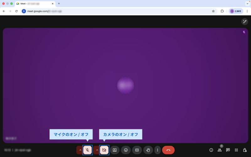 画面下の各種ボタンを押すと、マイクやカメラをオンにしたり、オフにしたりすることができます。