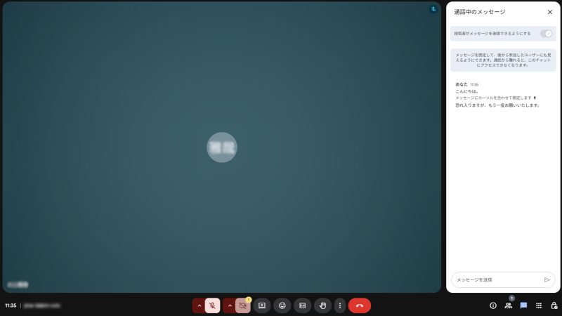 画面右下の吹き出し機能を押すと、「チャット機能」を使うことができ、テキストで質問や意見を送ることが可能です。送ったメッセージは会議に参加している全員に公開されるので注意しましょう。