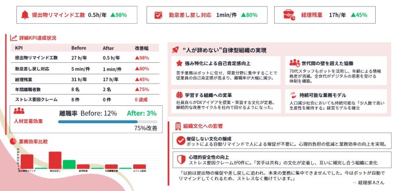 同社のDXは単なるシステムの移行に止まらず、業務の効率化、さらには組織文化やワークスタイルの変革につながり、かつて12%あった離職率が3%まで低下するという成果が表れるまでになりました。