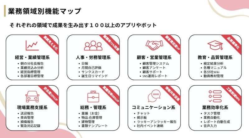 さらに導入から1年の間に、Larkの運用を主導していた部署が中心になってアプリやボットを100以上作りました。ノーコードでアプリが作れるということで、新しいシステムを使っていくうちに、これもできそう、あれもできそうとなって、加速度的に増えていった感じです。