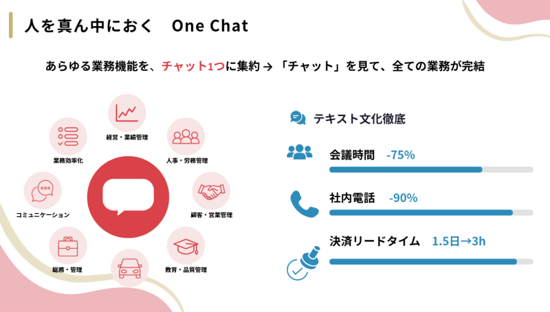 まず変えたのがチャットです。チャットツールはどれも基本的な使い方はあまり変わりませんし、既存のワークフローと連携させて社内申請に関するお知らせや手続きを促す通知も見られるようにしましたから、すごく便利になったという声がもらえました。
