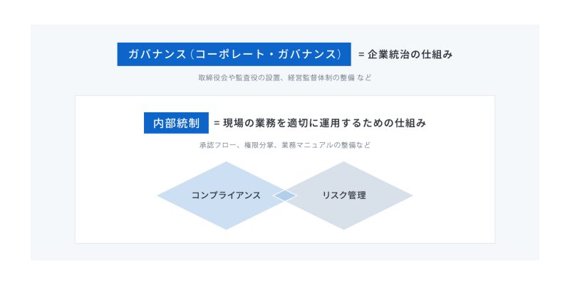 一方で、承認フロー、権限分掌、業務マニュアルの整備など、現場の業務を適切に運用するための仕組みは内部統制に位置づけられます。
