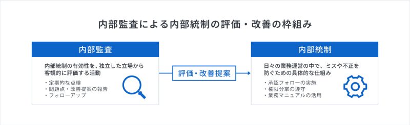 すなわち、内部統制が「業務を適切に運営するための仕組み」であるのに対し、内部監査は「その仕組みが有効に機能しているかを評価・改善する活動」と整理することができます。