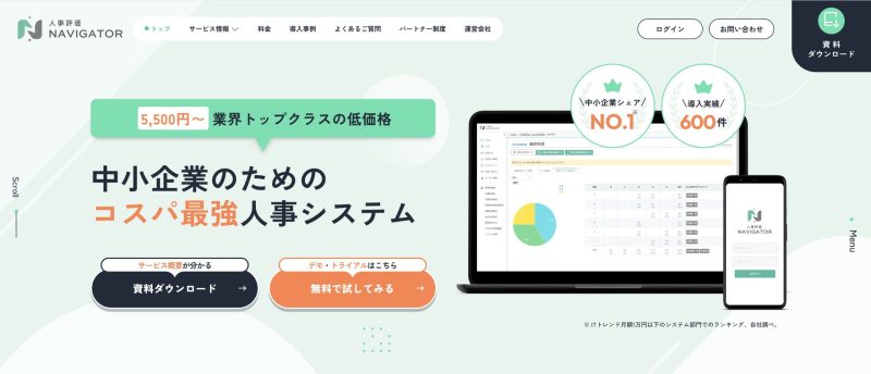 | 人事評価ナビゲーター | 月額5,500円〜(15名以下、税込) +初期費用11万円〜 |