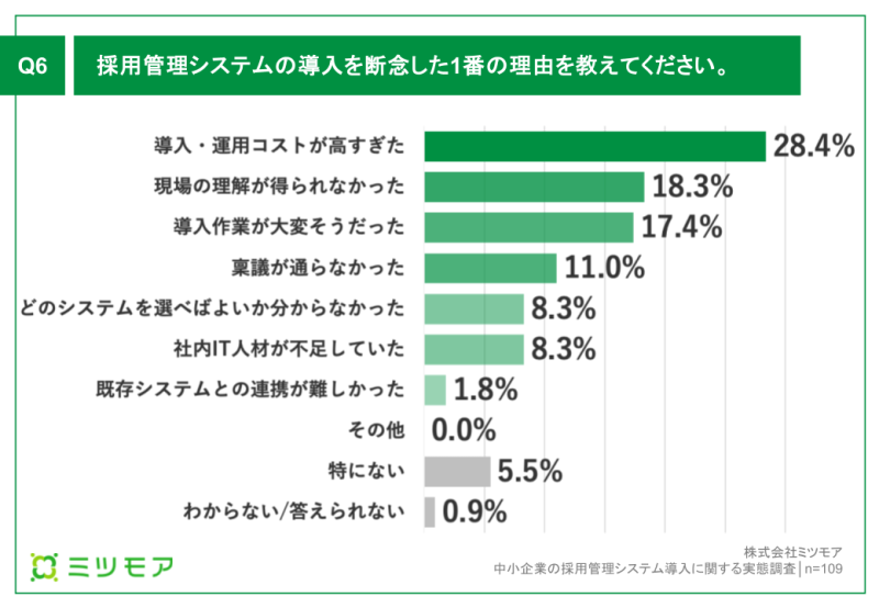 株式会社ミツモアが行なったアンケート調査によると、「採用管理システムの導入を断念した1番の理由」として挙げられたのが「導入・運用コストが高すぎた」(28.4%)でした。
