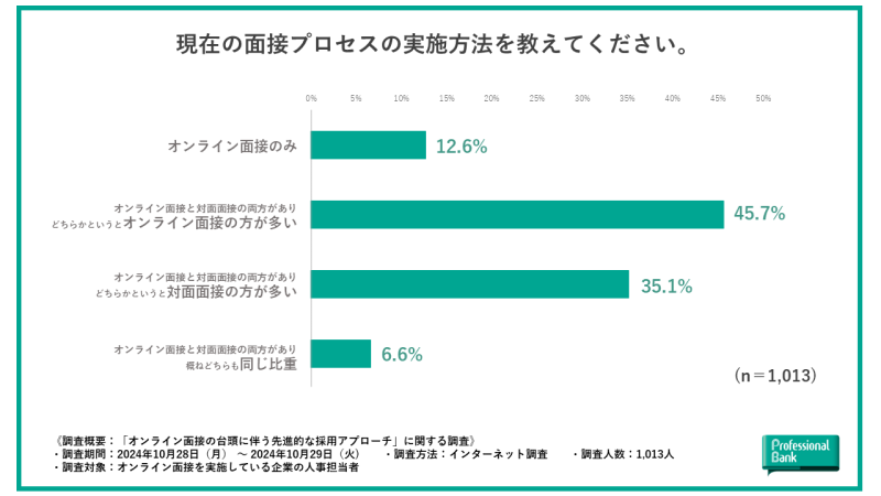 実際、オンライン面接と対面面接をハイブリッド運用している企業が9割という調査データもあり(出典:株式会社プロフェッショナルバンク「オンライン面接による先進的な採用アプローチ実態調査」)、オン・オフ両手法の特長を活かした運用が主流となっているようです。