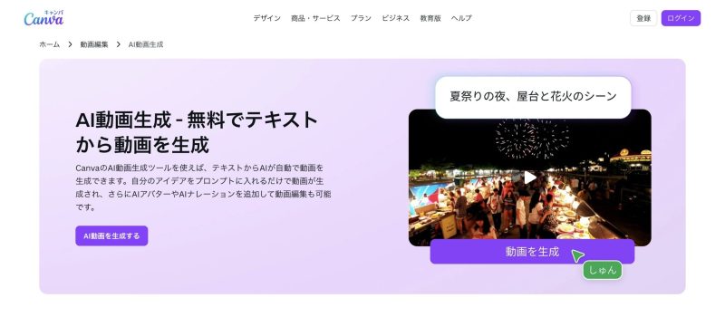 デザインツールとして有名なCanvaに搭載されている、AI動画生成機能です。テンプレートを選び、テキストを入力するだけで、すぐに動画が作れます。日本語にも完全対応しており、SNS投稿やプレゼン動画作成にも最適です。初心者でもわかりやすい操作画面で、無料プランもあります。