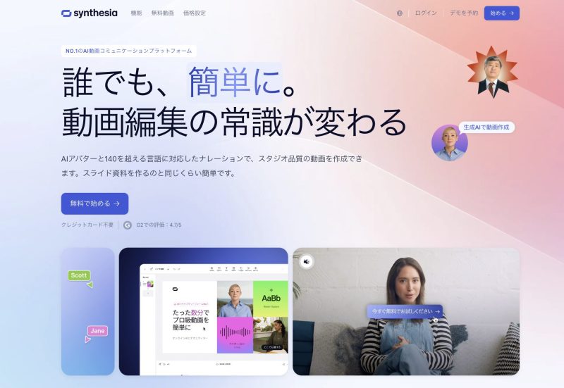 世界的に利用されているAIアバター動画生成ツールです。テキストを入力するだけで、実在するような人物アバターが話す動画を生成できます。高品質なナレーションと自然な口の動きが強みで、非デザイナーでもプロ級に仕上げられるでしょう。140以上の言語に対応しているのも特徴。性別、国籍、人種、肌の色、年齢、衣装なども選べます。