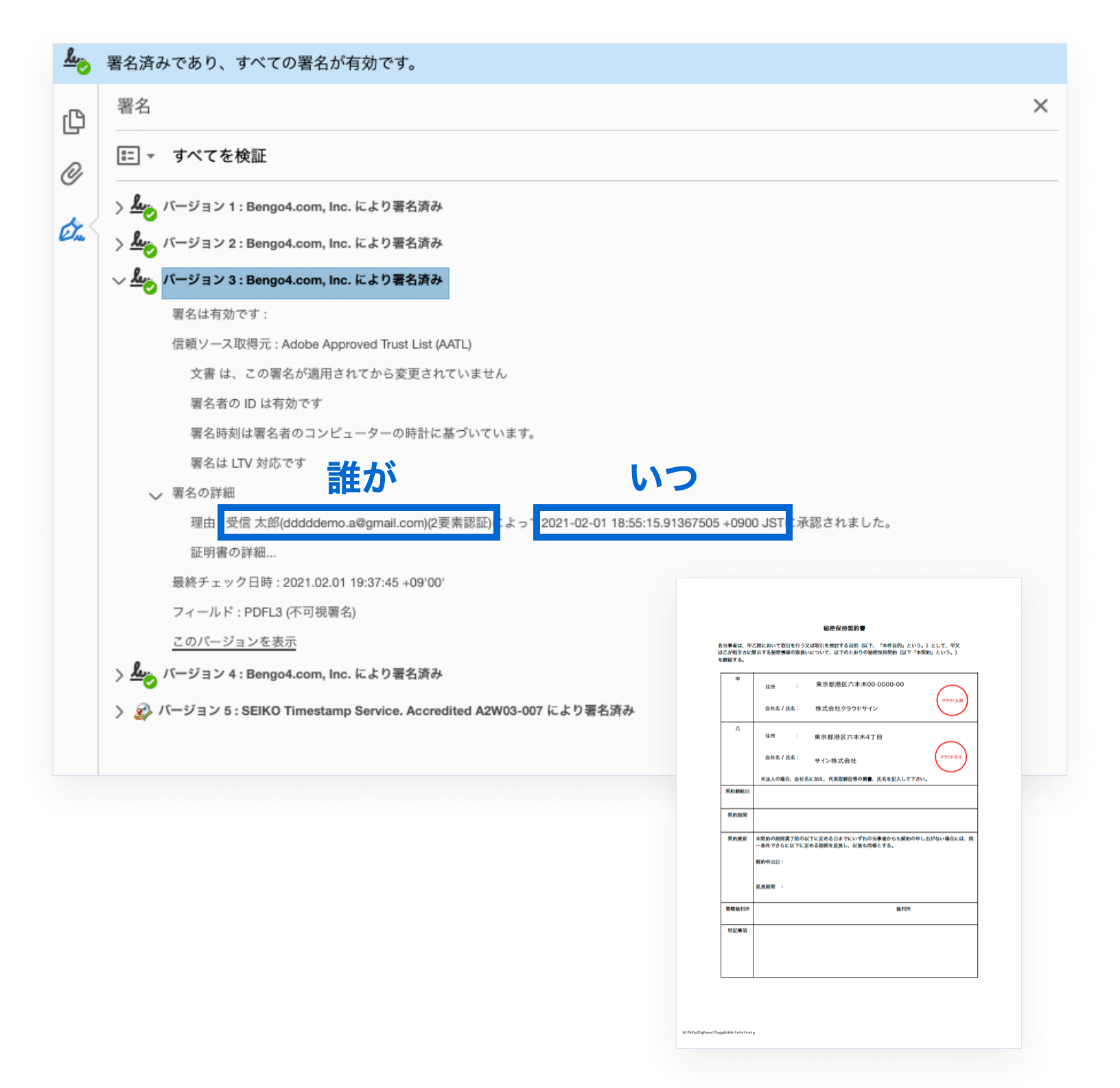 しかし、クラウド型電子署名サービスのほとんどが、インターネットに接続されたパソコンで電子署名済みのPDFファイルをAcrobat Readerで開くだけで、「署名パネル」の詳細から誰が・いつその文書の内容に同意したのか、その後改変されていないかが、かんたんに確認できるようになっています。