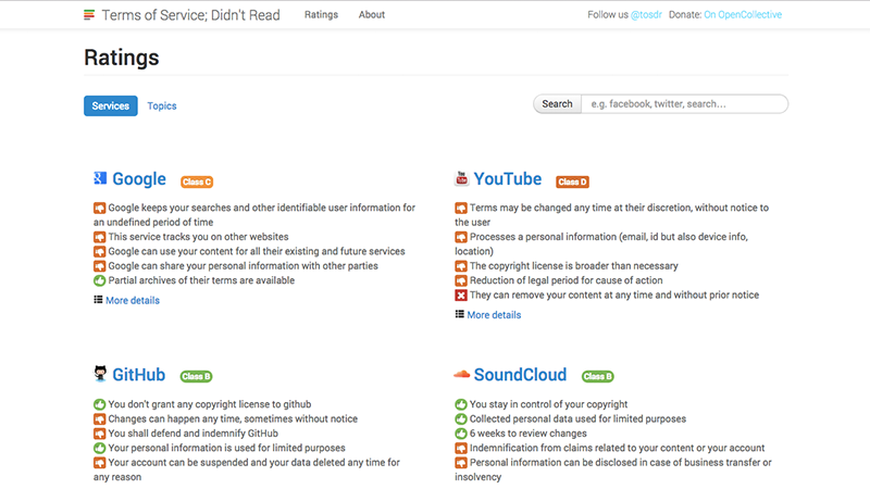 そこで、この状況を解決するアイデアとして、「自分ではない誰かに代わりに利用規約を読んでもらい、その評価スコアと要約をみんなでシェアしたら良いのでは」と考えたサービスがあります。それがこの「Terms of Service; Din’t Read」です。日本語に訳すなら、「どうせ君が読まなかったであろう利用規約の数々」といったニュアンスでしょうか。このサービスの存在は、公私ともにお世話になっているシティライツ法律事務所の平林健吾先生(@kengolaw)に教えていただきました。