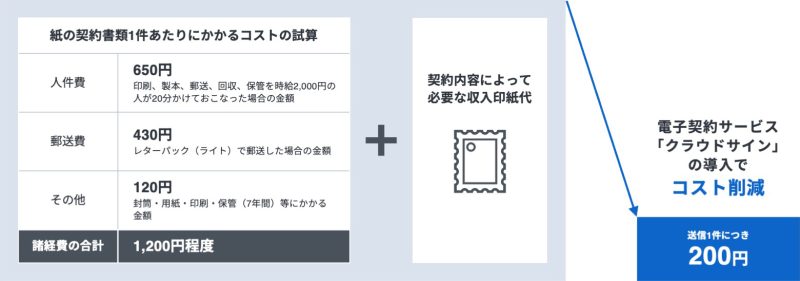 また、紙の契約書類1件あたりにかかる諸経費は1,200円という試算結果もあり(当社独自調査による)、電子契約サービスを導入し、紙の契約書に伴う印刷や郵送の手間を省くことで、大幅なコスト削減につながります。