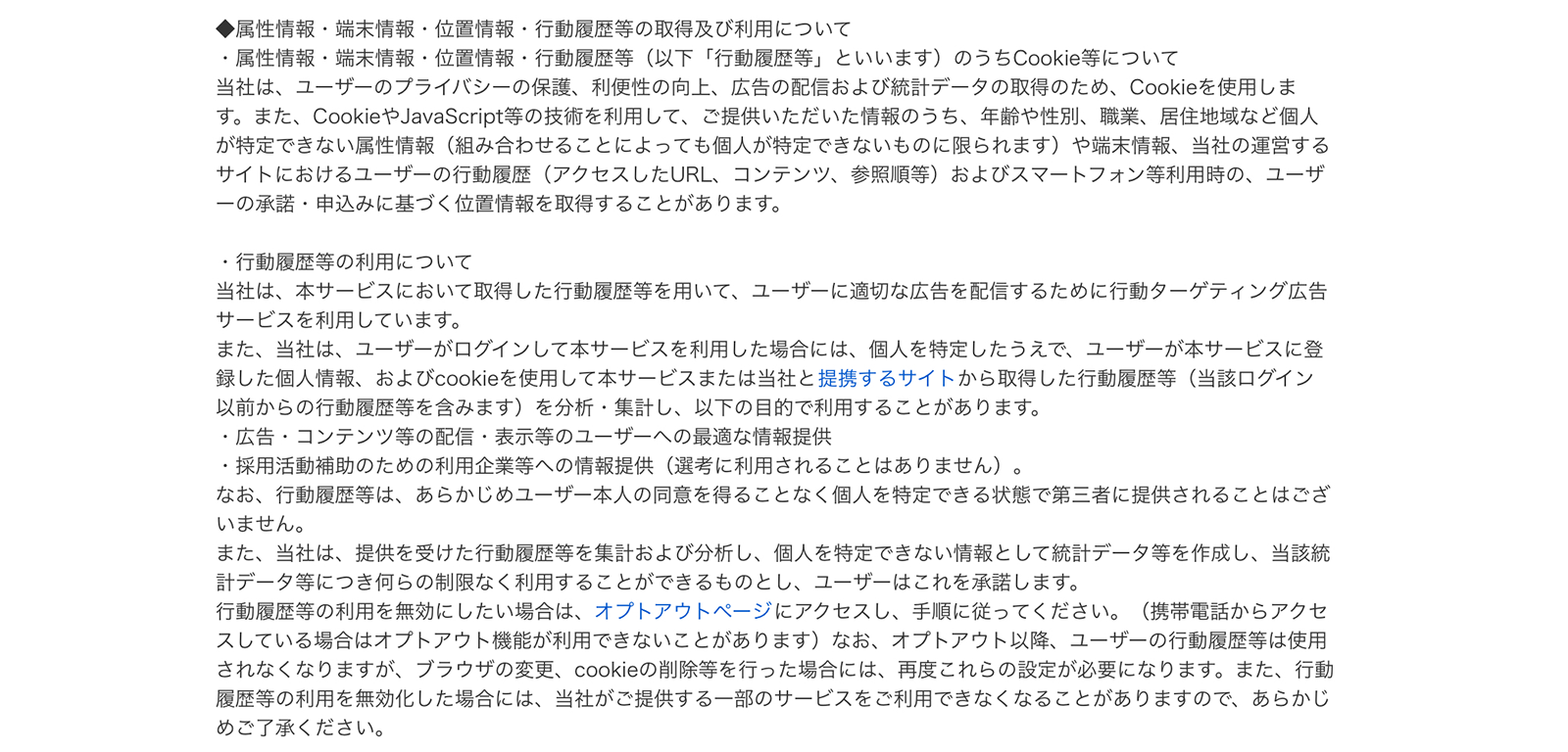 まずリクナビが学生から取得する個人情報の利用目的についての同意根拠となっている「プライバシーポリシー」において、ウェブ上の行動履歴の利用に関しては、「I.属性情報・端末情報・位置情報・行動履歴等に基づく広告・コンテンツ等の配信・表示、本サービスの提供」と記載されています。