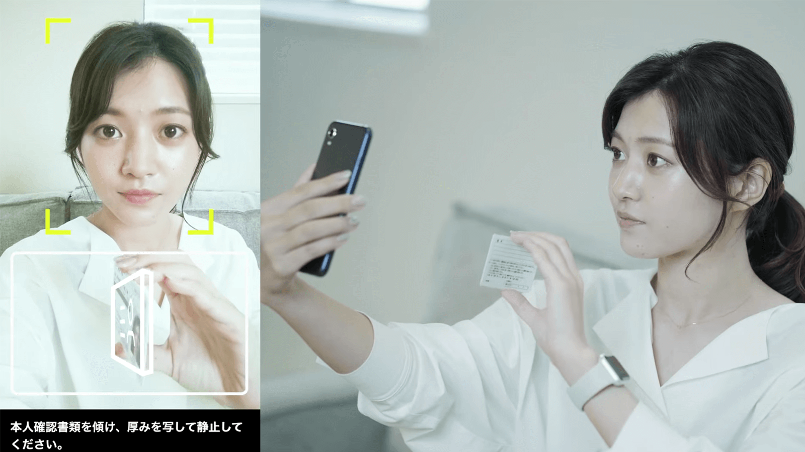 ここでは、犯罪収益移転防止法施行規則6条1項に定める要件を満たすために、以下画像のように身分証明書の「厚み」がわかるよう、カードを傾けて撮影させているのが分かります。