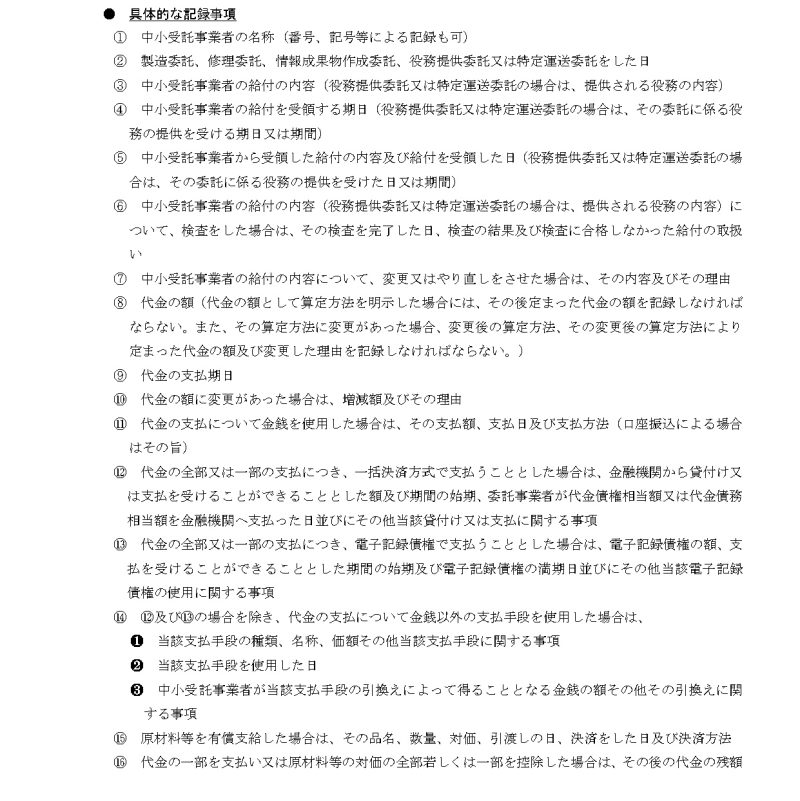 取適法の適用を受ける取引を行なう委託事業者(旧:親事業者)は、以下の事項を記載・記録した書類(または電磁的記録)を作成し、2年間保存しなければなりません(取適法第7条、同規則第1条第1項)。