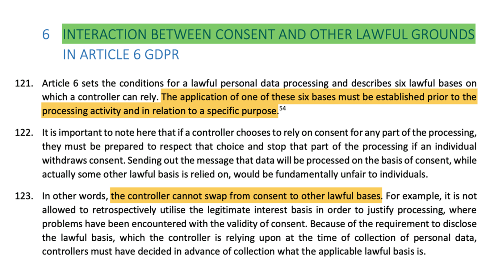 - 「同意」を根拠とした場合には、別の根拠に乗り換えることはできないこと(cannot swap from consent to other lawful basis.)