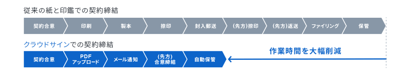 紙の契約書で締結した場合と電子契約サービス「クラウドサイン」で締結した場合のリードタイムの比較イメージ