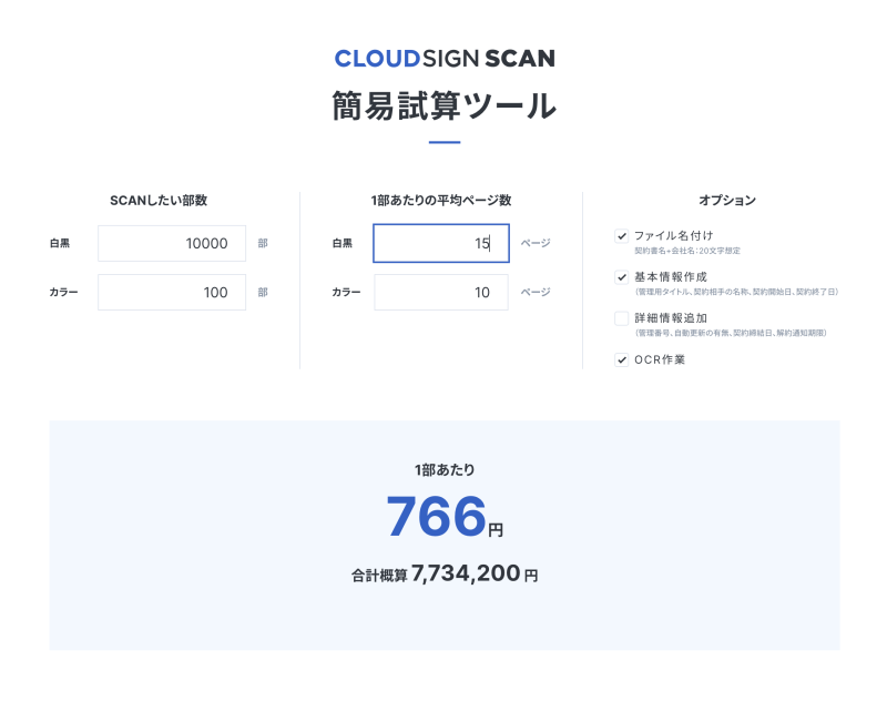 契約書のスキャンサービスは、実際に発注するまで価格が不明瞭なサービスも少なくありません。クラウドサインでは、貴社の契約書保管状況に応じてコスト概算見積もり金額が算出できる「クラウドサインSCAN簡易試算ツール」を用意し、大量の契約書のデジタル化に必要な予算をすぐに把握することができます。