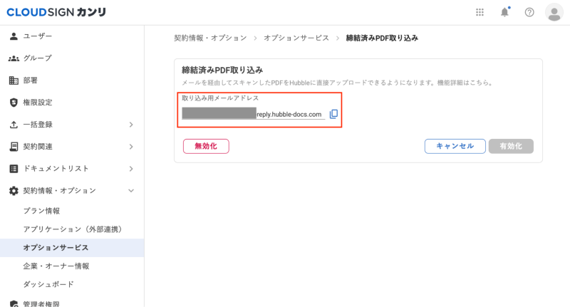 取り込み用のメールアドレスを発行していただくと、このメールアドレス宛に送られたPDFをクラウドサイン カンリに取り込むことができます。