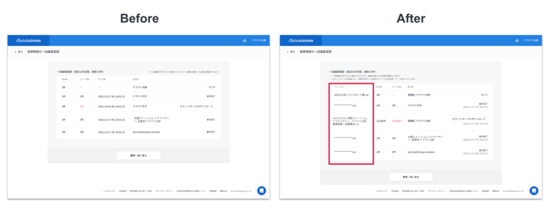 書類情報の一括編集履歴にて、アップロードした「ファイル名」が確認できるようになりました。