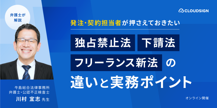 本セミナーでは、混同しやすい下請法・フリーランス新法・独占禁止法の概要と比較から、業務上のポイントまでを詳しく解説します。