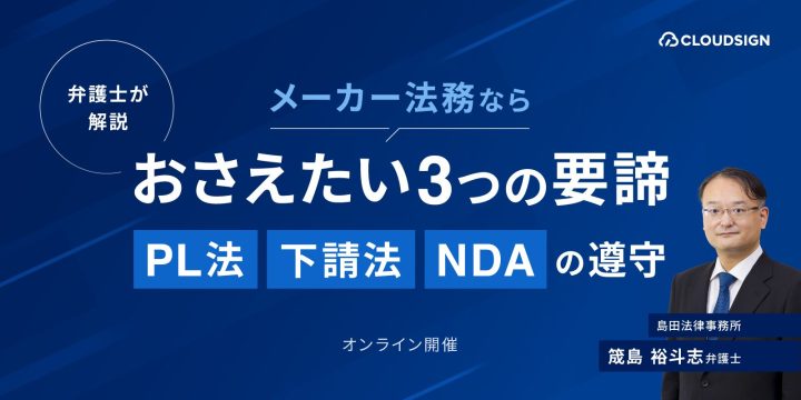 本セミナーでは、複数の著書を執筆してこられた弁護士の筬島先生をお招きし、特にメーカー法務としてリスクが高く、実務対応が求められるPL法(製造物責任法)、下請法、NDAの3点に焦点を当てて徹底解説します。 -