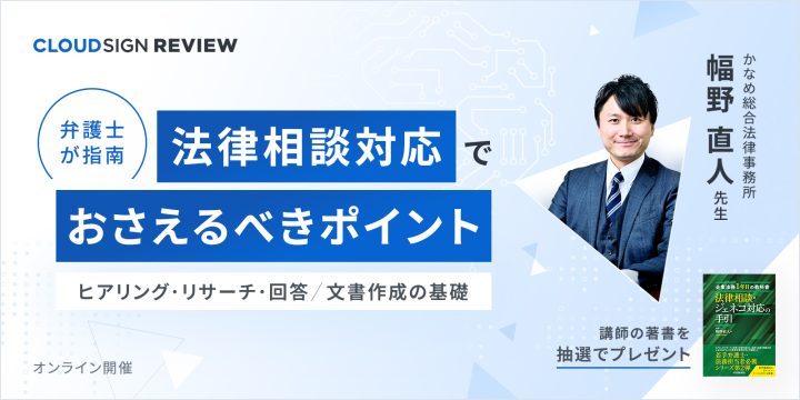 本セミナーでは、【企業法務1年目の教科書 法律相談・ジェネコ対応の手引」の出版をされたかなめ総合法律事務所の幅野直人先生にご登壇いただき、法律相談(法務相談)対応をテーマに円滑に進めるためのポイントを解説いたします。
